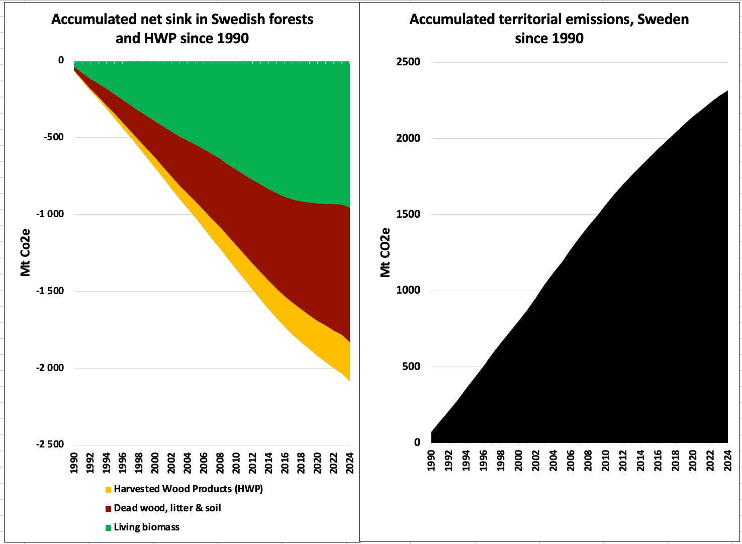 And this still doesn’t tell the full story of how Sweden helps EU towards climate neutrality, because climate benefits that accrue from exported goods are not included in conventional climate book-keeping. With 85% of wood-based products being exported from Sweden, there is more to say. More on this below.