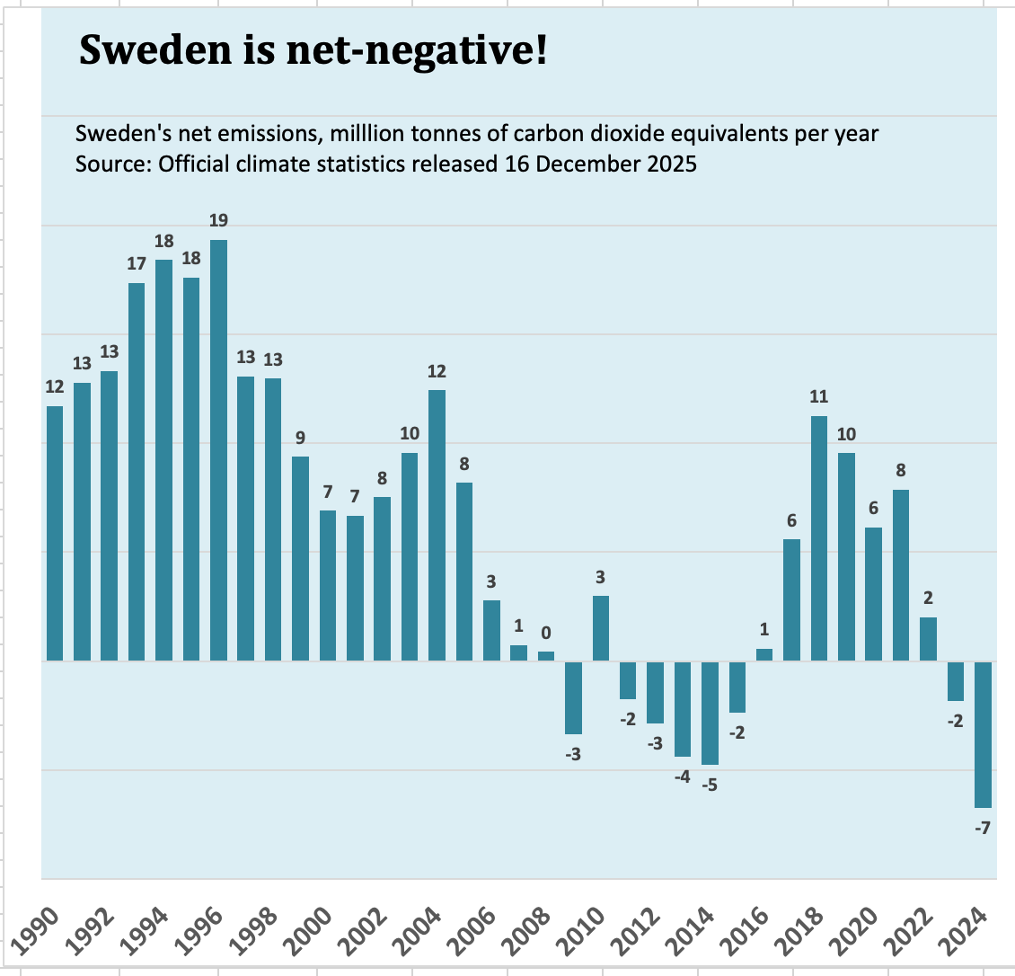 On December 16th, Sweden’s official annual report of emissions and removals was released, covering the period 1990-2024. The results were astonishing. Sweden was net-negative in 2024 by as much as 7 million tonnes of carbon dioxide equivalents!