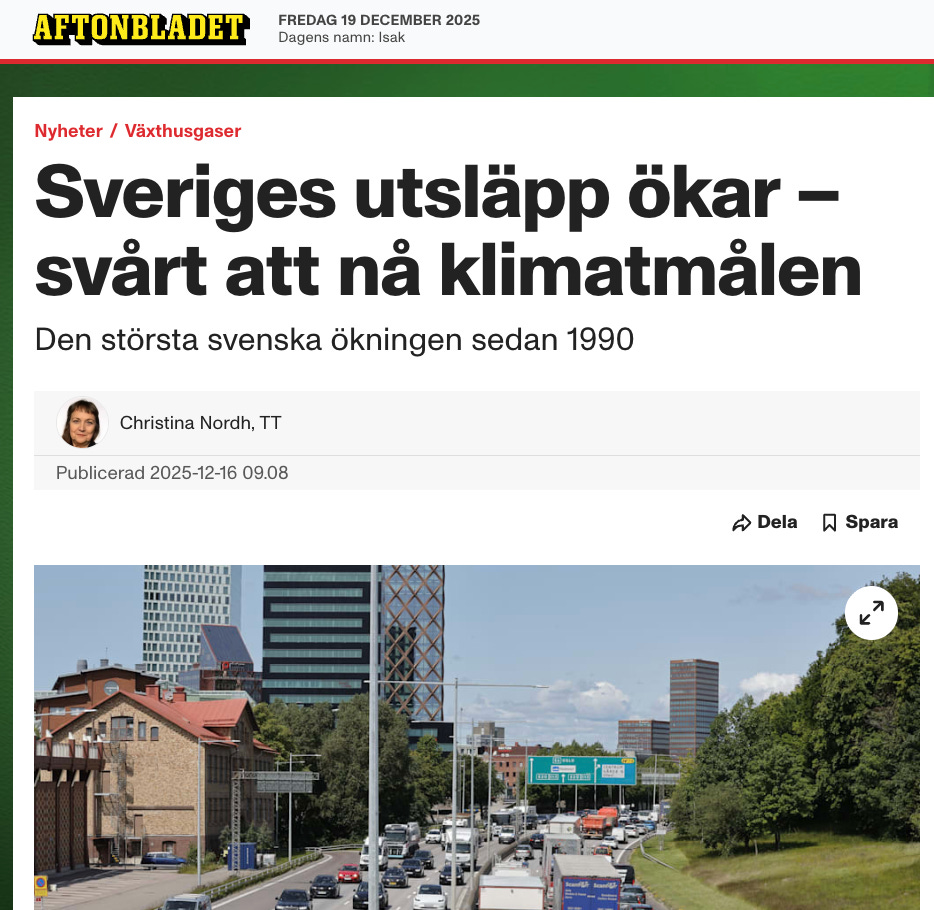 Subsequent news stories to the new report were not about Sweden going climate-negative, but mainly about the much smaller increase in emissions - about 3 million tonnes from 2023 to 2024.
